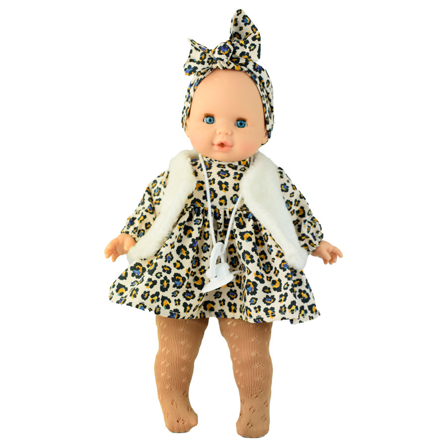 Ihr Outfit ist ein echtes Highlight: ein Kleid mit modernem Leo-Muster, dazu eine kuschelig weiche weiße Weste, eine hellbraune Strumpfhose und ein perfekt passendes Stirnband. Alles ist liebevoll aufeinander abgestimmt und kann natürlich jederzeit an- und ausgezogen werden. So können Kinder kreative Rollenspiele ausleben und Lea immer wieder neu stylen.